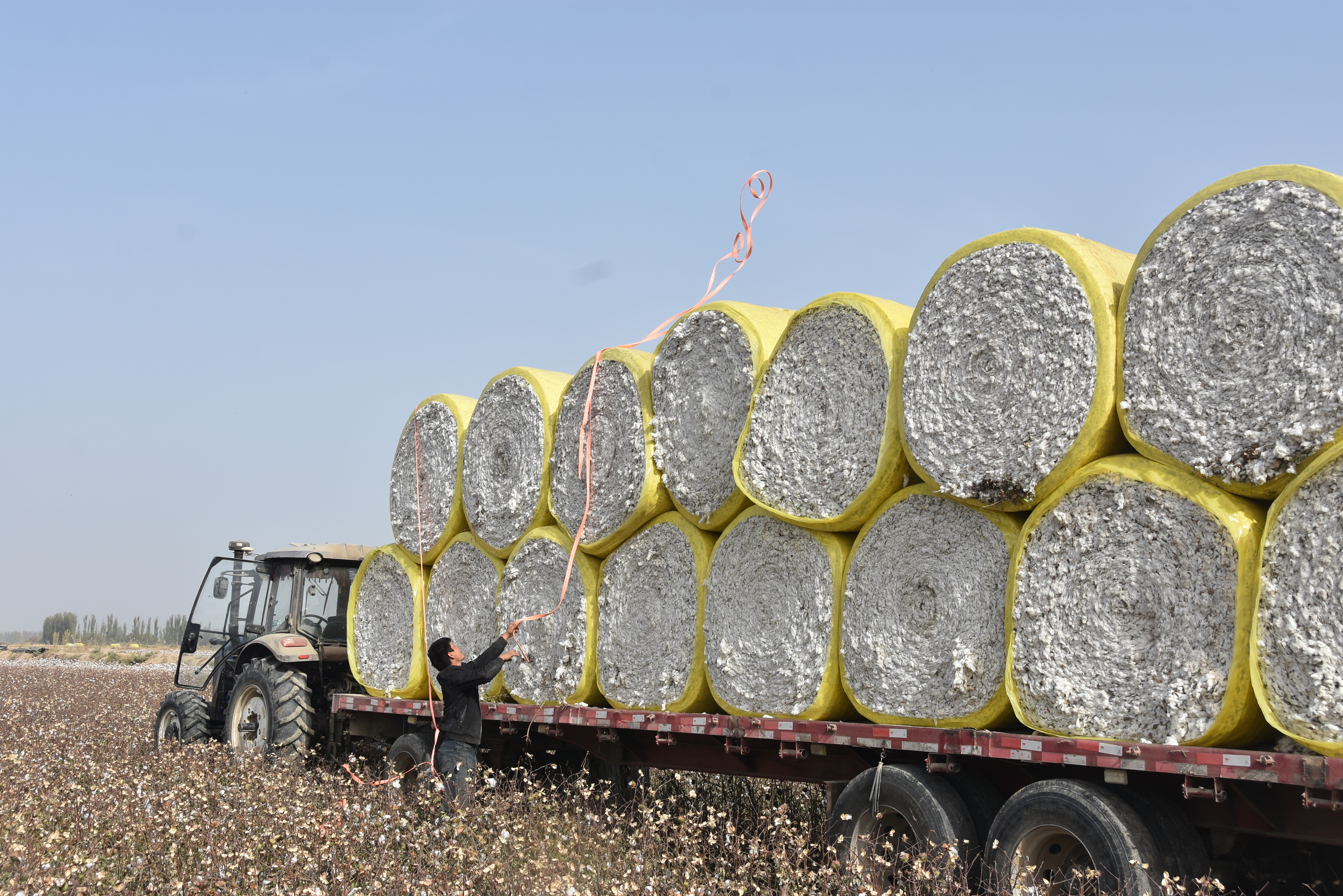 10月21日,在新疆阿克苏地区沙雅县的棉田中,棉农在固定棉花包。新华社记者顾煜 摄