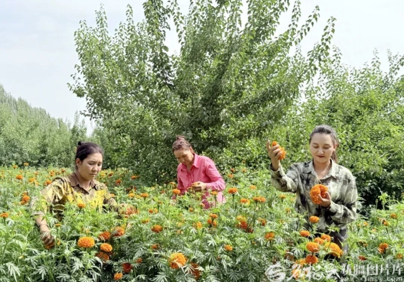 英吉沙县苏盖提乡色日格拉村村民在果园里采收套种的万寿菊。英吉沙县融媒体中心供图