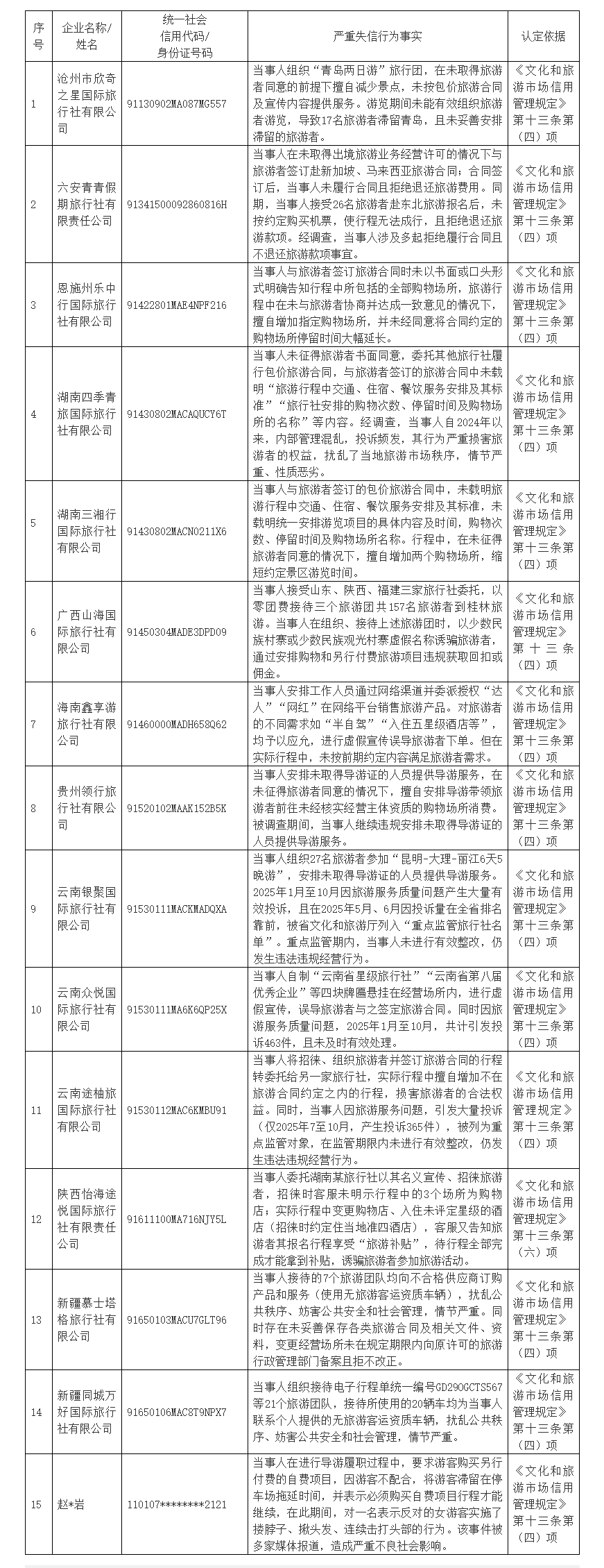 旅游市场秩序集中整治工作开展以来,各地依法查办了一批重大案件,并依法依规开展失信主体认定,截至2026年3月底,全国文化和旅游市场共认定失信主体1655个。为落实《国务院办公厅关于进一步加强旅游市场综合监管的通知》有关要求,提升信用监管效能,营造诚信、公平、有序的旅游市场环境,现对旅游市场秩序集中整治严重失信主体典型名单予以公布。